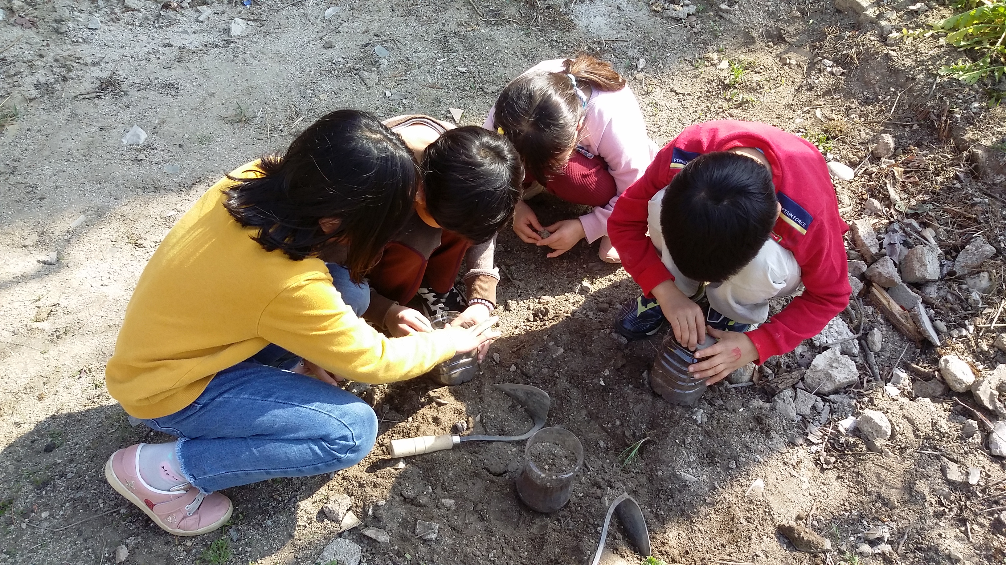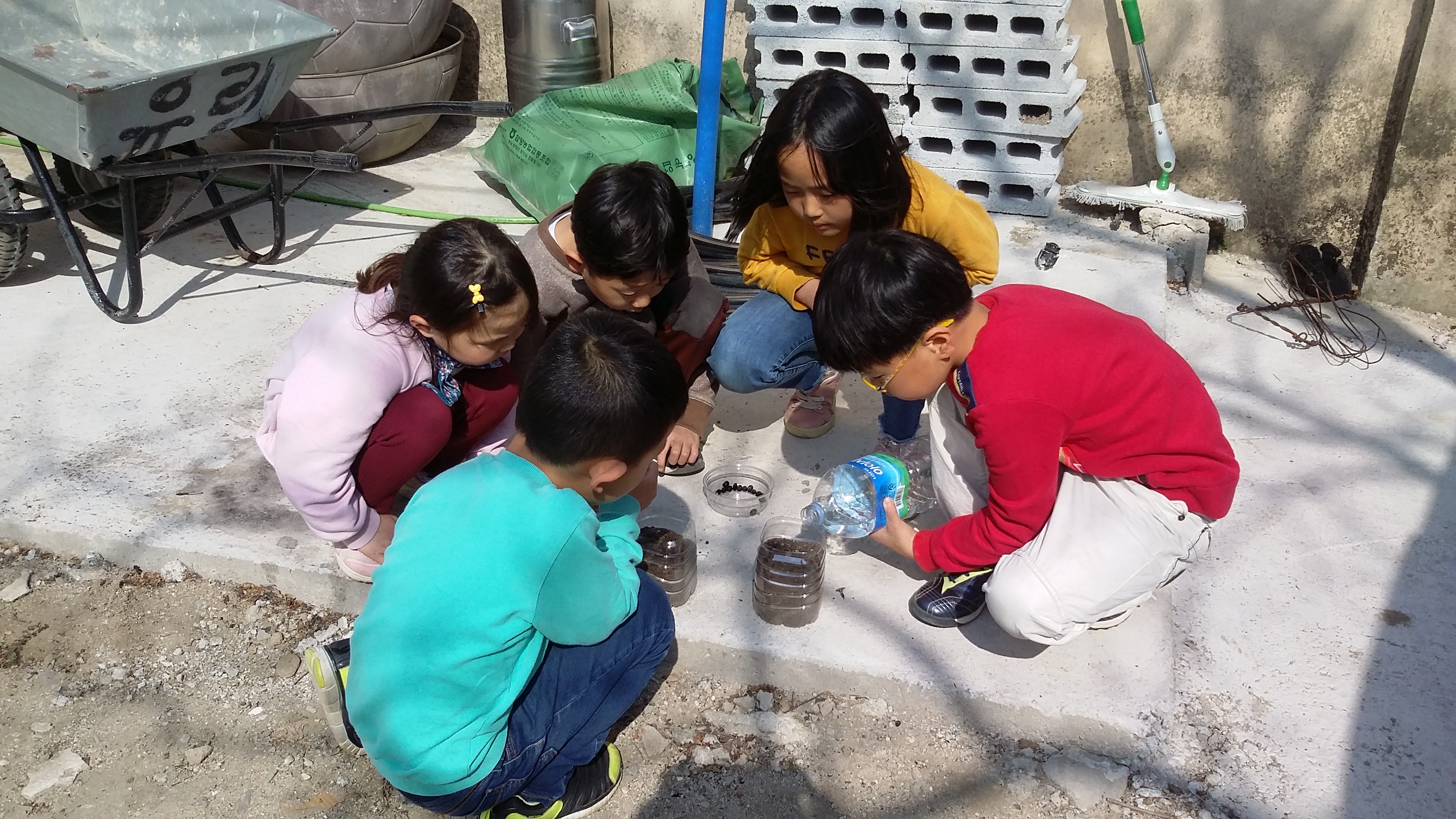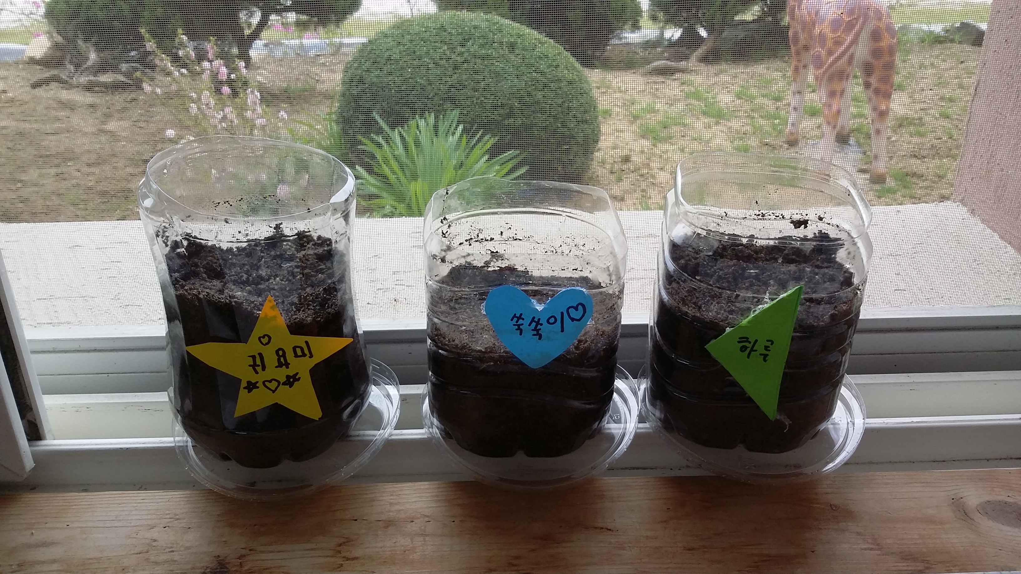 빈 패트병에 구멍을 뚫어 흙으로 채운후