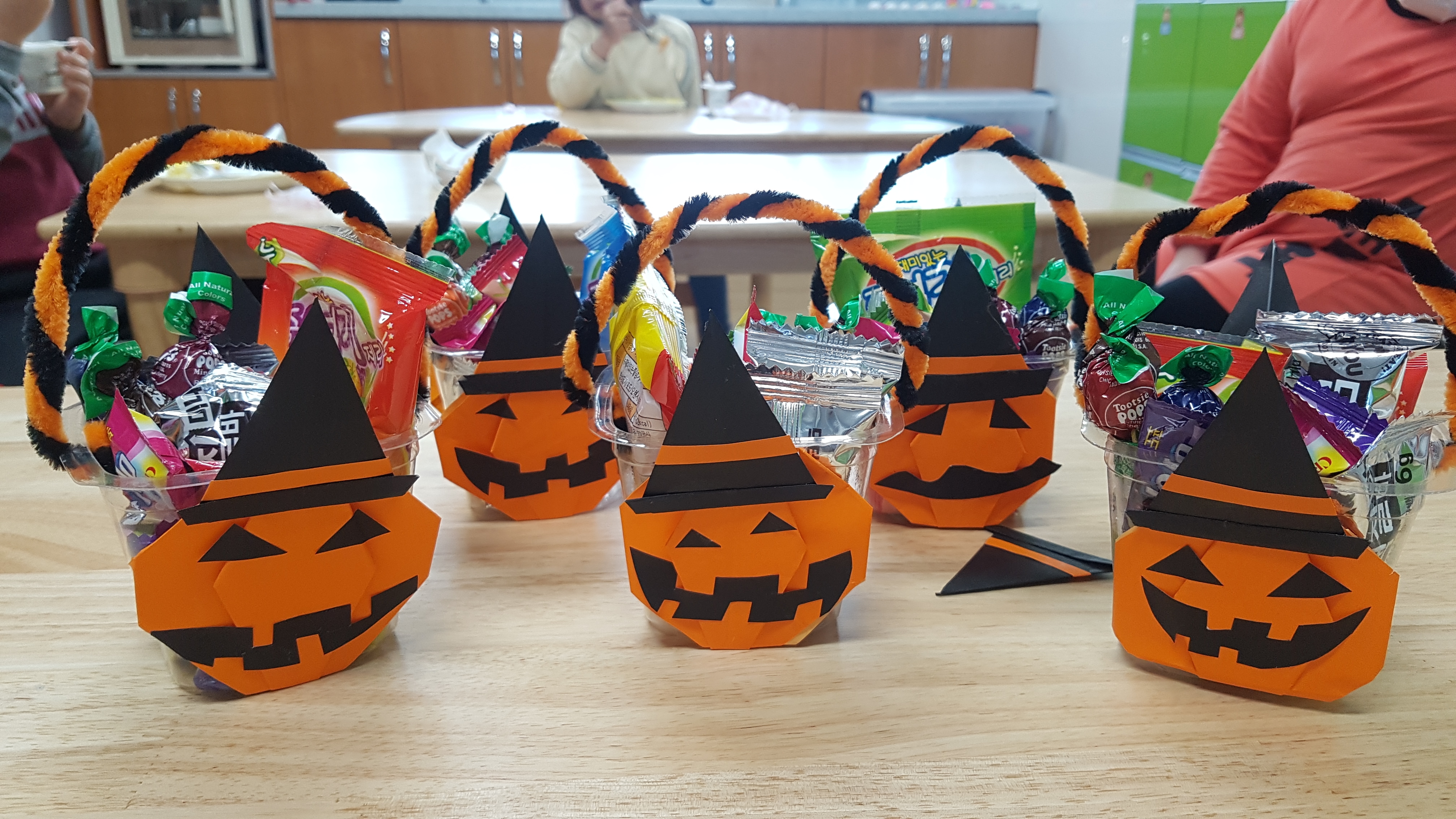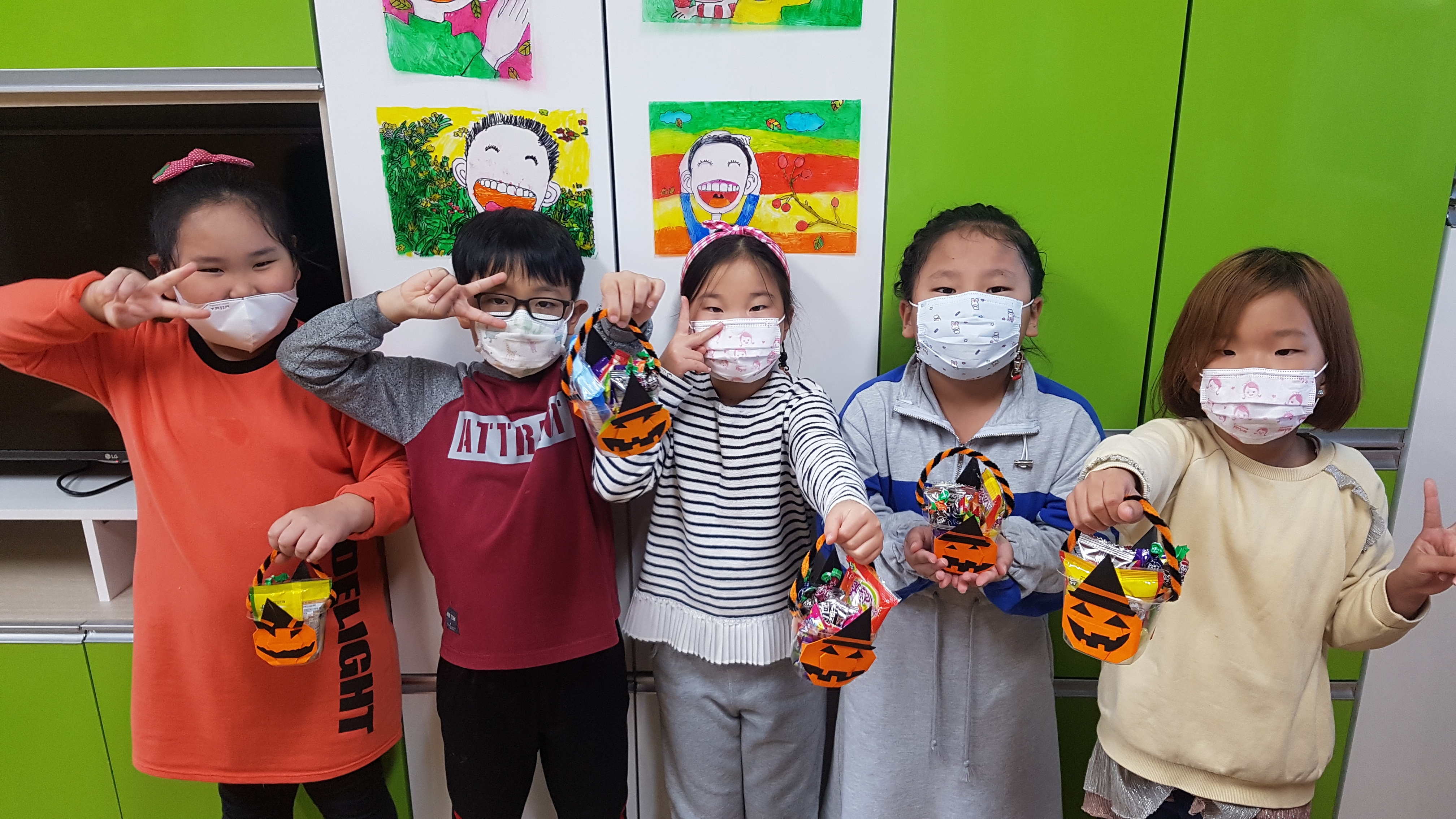 바구니에 사탕 가득 담으니 얼굴에 웃음꽃이 활짝 피었습니다